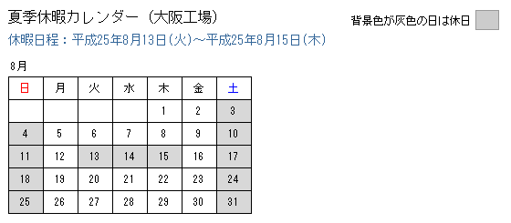カレンダー形式はクリックしてご参照ください。[ 閲覧 ]■大阪本社・東京本社・関東工場: